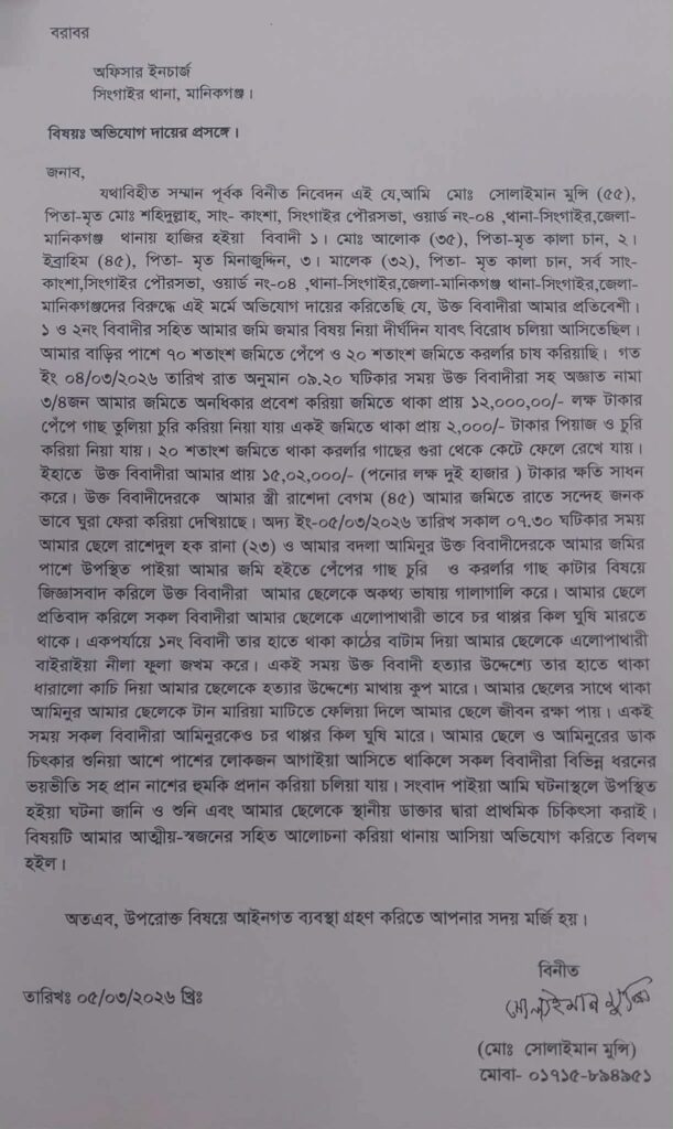 অভিযোগ সূত্রে জানা যায়, সিংগাইর পৌর এলাকার কাংশা গ্রামের বাসিন্দা মো. সোলাইমান মুন্সি দীর্ঘদিন ধরে তার বাড়ির পাশের প্রায় ৭০ শতাংশ জমিতে পেঁপে ও বিভিন্ন সবজি চাষ করে আসছিলেন।